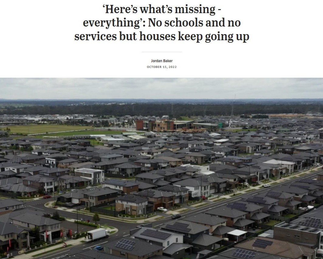 But people moving into those areas say it takes more than a bunch of rapidly constructed houses to create a community. “So here’s what’s missing,” said Angela Van Dyke of the Riverstone Neighbourhood Centre and Community Aid Service. “Everything. Public education. Public transport. Good urban design. Livability.” SMH